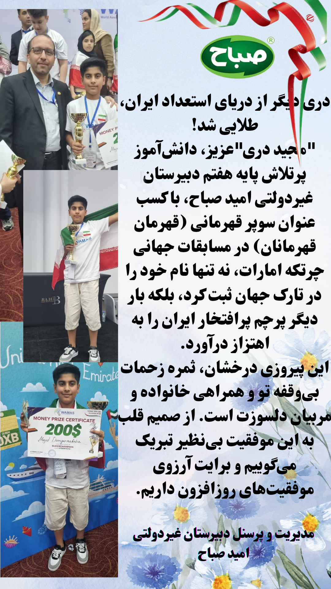 کسب عنوان سوپر قهرمانی (قهرمان قهرمانان) دانش آموز مجید دری پایه هفتم دبیرستان صباح دسته بندی ادامه مطلب